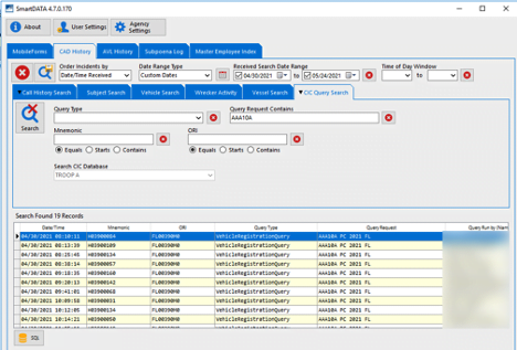 SmartData has built in functionality to search CIC Query Data. This helps agencies fulfill internal investigations to see when a DL or Reg Tag was queried and provides information on who, when, and what was searched.